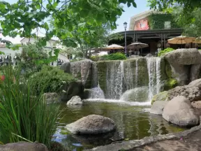 Pleasant garden with waterfall, huge lizards, boulders, pavilions with lovely circle windows and distinctive roofs, and pond, but some city noise.