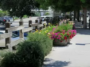 Gorgeous main street with large, European-style park where people sit on the grass by the fountain.