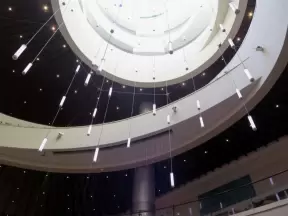 Incredible glass building with interesting activity stations for kids and modern art for parents.