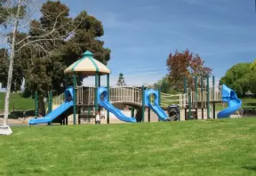 A beautiful park with redwoods, deciduous trees, winding paths, a grassy amphitheater, a large new playground with interesting structures, and tennis courts.