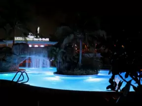 Gorgeous pool areas with splash pad and water cannons, lit up beautifully at night.