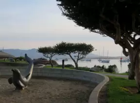 Cement ship playground with logs to climb, seal, dolphin, whale's tail and giant octopus sculptures, picnic tables, and an amazing view of Morro Rock and the inlet.