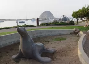 Cement ship playground with logs to climb, seal, dolphin, whale's tail and giant octopus sculptures, picnic tables, and an amazing view of Morro Rock and the inlet.