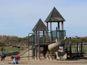 Wide-open park across the street from the beach with playground with pretend train, picnic pavilions, and sand volleyball courts.