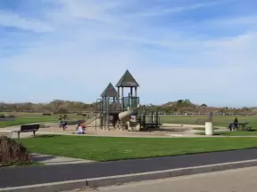 Wide open park behind the dunes in Morro Bay, with play structure with sand floor, and huge lawn with winding paths for tricycling.