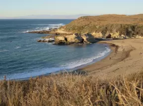A secluded beach with golden bluffs, little birds running along the shore, a surfer or two, and forest behind.