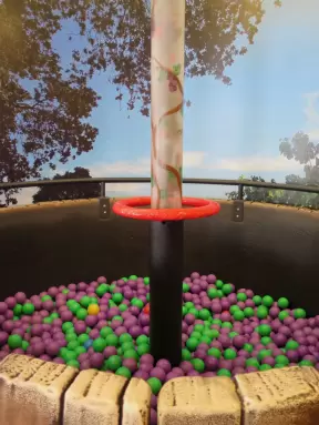 Attractive children's museum with market and carts, Newton's playhouse where you can shoot balls, ball pit, fire engine, oak tree tunnels, stage, dress-up area, and pizza kitchen.