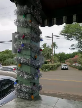 Nice little main street, with cafes, pretty storefronts, park, swinging bridge over a creek with tropical vegetation, and neighborhood with white picket fences and gardens.