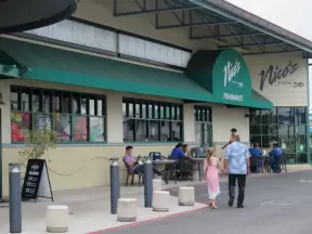 A popular town center with sidewalk cafes leading down to a pretty lake with a walking path.