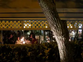 An outdoor mall under a huge banyan tree hung with lanterns. Beautiful flowers by a stream, rock-like seats kids love, and rain fountain.