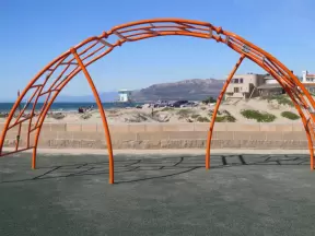 Modern playground with Chumash Indian huts and canoe, seals and whales to climb, roller slide, rainbow bridge, and bald eagle in a nest.