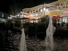 Spiffy outdoor mall with cute inner courtyard with strung lights, palms, and fountain.