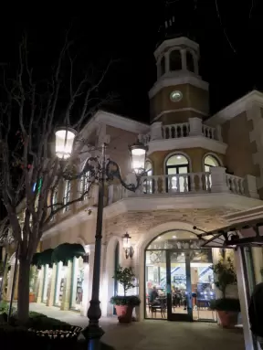 A shopping plaza with sidewalks cafes and shops that would look like Europe if it weren't so new!