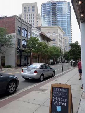A main street of late 19th century storefronts, popular cafes, and a hip college scene. Recently, suffering an epidemic of homelessness relating to mental health problems.