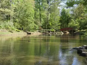 Peaceful greenway with flowers and almost tropical vegetation, that takes you to a lake!