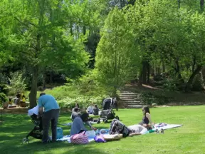 A large park with beautiful tall trees, playground with huge slides, gazebo, and a pleasant lake where you can rent paddle boats in summer.