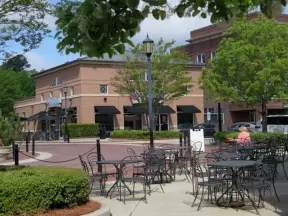 Shopping center close to the freeway, with a Barnes and Noble Bookstore and some cafes with flower planters and space outside where kids can run around.