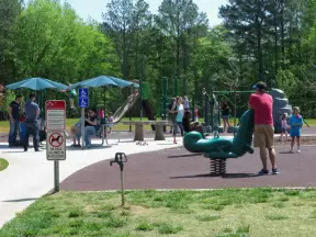 A super fun playground with a giant space net, carousel, pony rides, train rides, and dog-friendly hiking and bike trails around a lake.