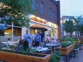Cute area with outdoor cafes, flower boxes, church steeple with chimes, and village green where family events such as movie night or games night are held.