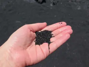 Wide-open beach with pale grey sand, shells on the shore, and aquamarine water, across from a playground, turtle center, and hike.