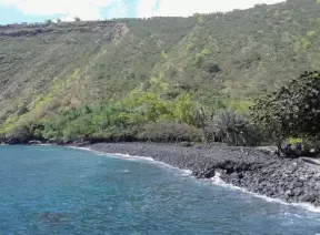 A bay with crystal clear water, high cliffs, and beach of huge pebbles. Best for snorkeling, not hanging out. Surfing in winter. Homeless encampment with dog bite warning signs.