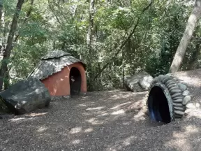 Modern playground with Chumash Indian huts and canoe, seals and whales to climb, roller slide, rainbow bridge, and bald eagle in a nest.