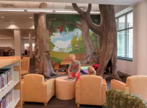 Attractive children's museum with market and carts, Newton's playhouse where you can shoot balls, ball pit, fire engine, oak tree tunnels, stage, dress-up area, and pizza kitchen.