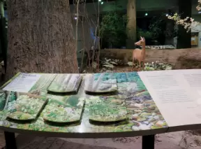 Two beautiful modern buildings full of attractive exhibits including some live animals.