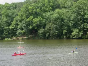 Beautiful lake with small beach, kayak rentals, and 3 mile shady paved walking loop around the lake.