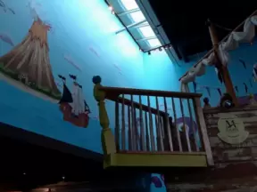 Large children's museum with ship with cannons, play houses, market and diner.