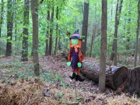 Whimsical sculptures of fairy tale scenes in the middle of a giant oak forest with Spanish moss and vines. Magic!