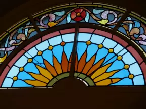 Stunning Spanish Renaissance style church with peaceful blue interior and Tiffany glass windows.