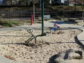 Lovely playground in a recessed forest area, with a greenway connecting to another great playground.