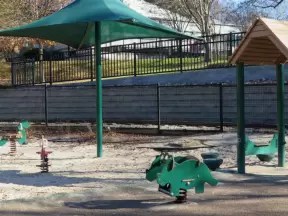 Wonderful playground with dragon on little hills, many different play areas, winding paths, and landscaping.