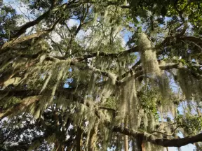 Short walk around shimmering lake with moss-draped trees, past Spanish mansions.