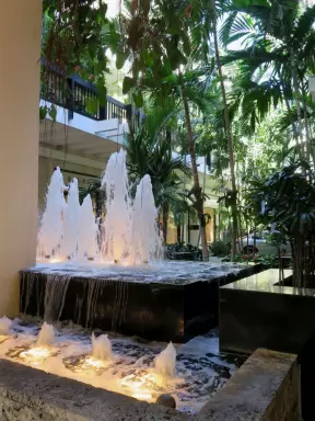 Outdoor shopping and entertainment district with European architecture, archways, palms, tropical flowers, and amazing fountain for kids.