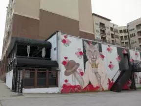 A trendy street in the middle of a sketchy neighborhood, with cafes and colorful graffiti-covered walls.