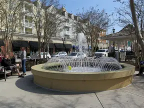 Town with splash pad on the lake, town square with cafes, playground, and lots of stores.