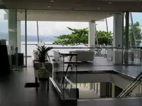 Fantastic outdoor mall with palm trees swishing in the breeze over a hardwood deck and a wood stage with live music on weekends.