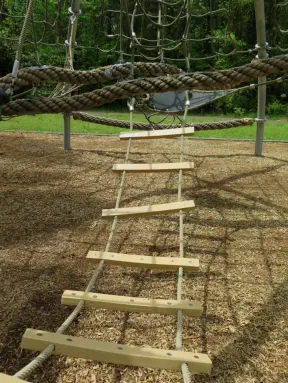 A wooden castle playground with gingerbread house, medieval towers, slides, bridges, monkey bars, rope bars, swings of all sorts, mist maker, viking ship, windmill, wild west town, rock-climbing wall, and tire swing.