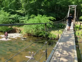 Pretty area with flowing river, rocks to play on, forest and flowers, and swinging bridge.