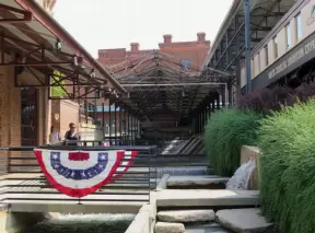 Unique redevelopment complex with man-made river, bee hive behind glass, colorful decorations, live music, and a few restaurants.