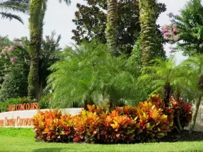 Beautiful garden with many partitioned areas, tropical plants, flowers, all with the blue lake behind. Plus, promenade around the lake.