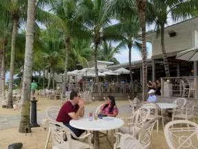 Beach with everything a beach should have: pale sand, aquamarine water, coconut palms, dunes, fit people, and cafes.