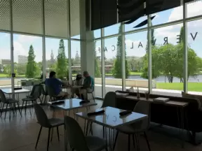 Riverfront modern two-storey building with exhibits on President Clinton's life and important changes he made during his presidency.