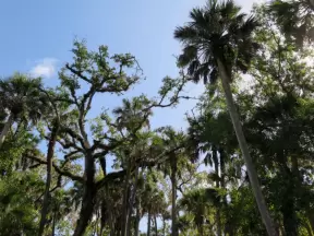 Tropical paradise with amazing trees, soft green grass, and woven huts shading picnic tables with BBQs that line the river, plus bike and kayak rentals. Beware alligators.