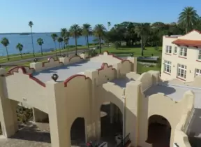 Modern campus with tropical blooming trees and Spanish architecture on the northern end of campus.