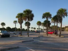Wide-open beach with pale grey sand, shells on the shore, and aquamarine water, across from a playground, turtle center, and hike.