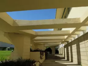 Private university with raised views over a lake, and Frank Lloyd Wright architecture.