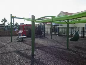 A colorful, fun playground with huge twisty slide, three-level climby, tractor, baby swings, basketball court, and giant lawn. Also called San Luis Ranch.